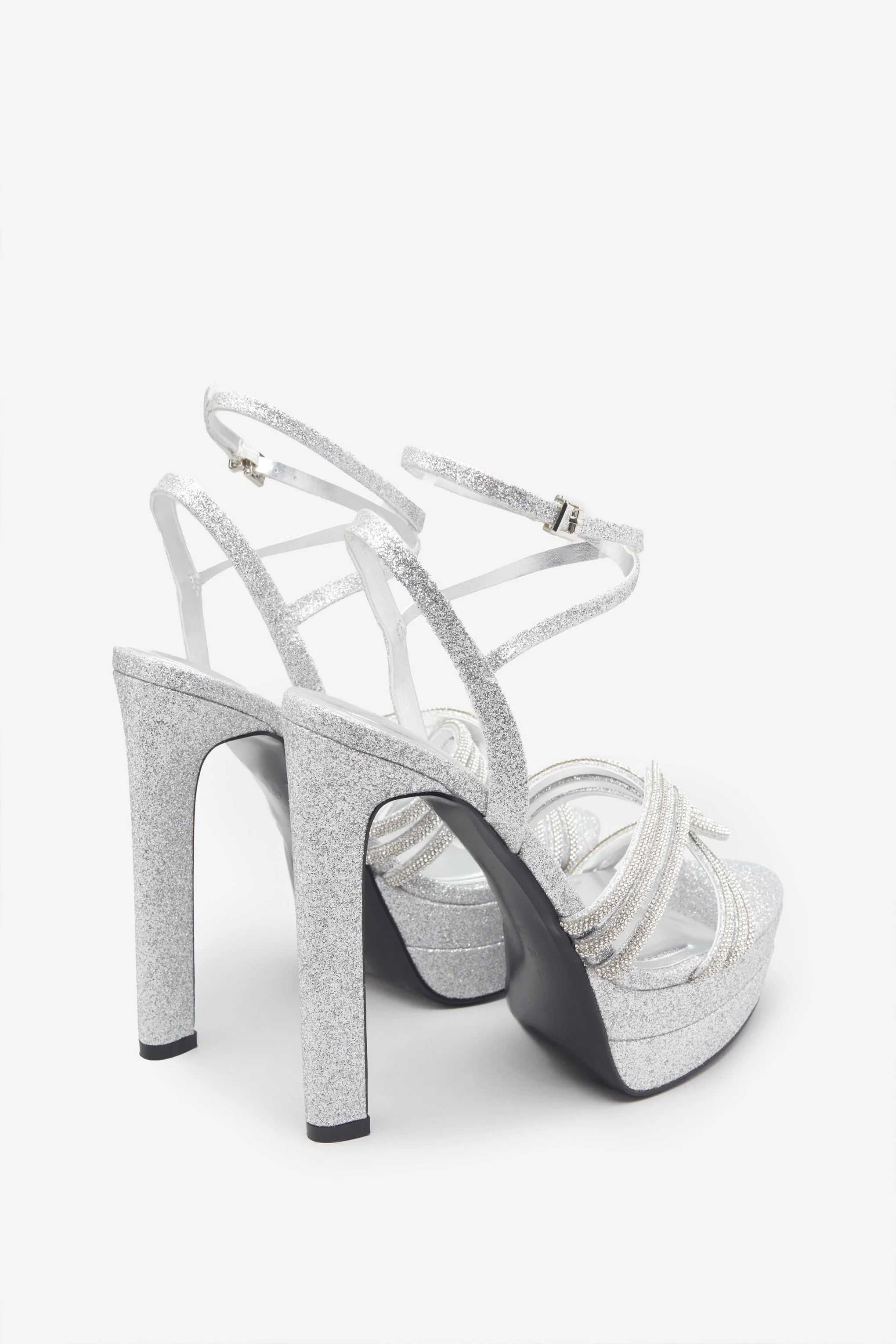 Doll Drama | Talons plateforme à lanières en satin argenté avec strass
