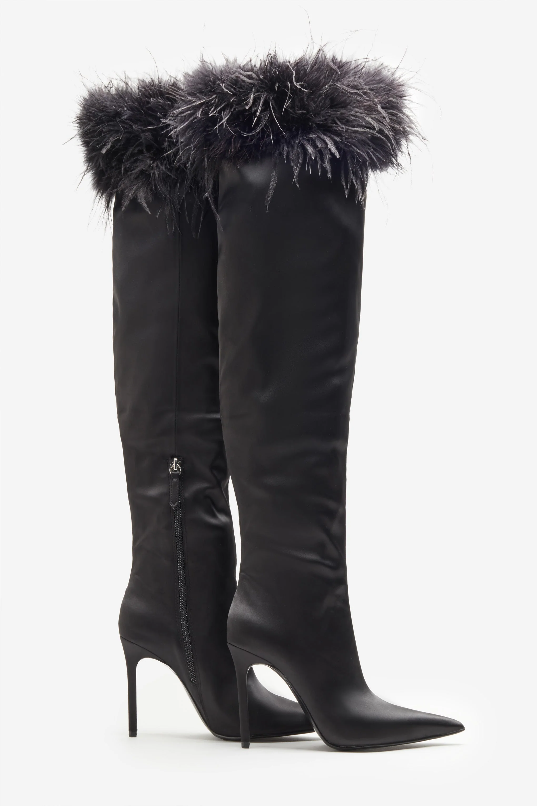 Soho | Bottes noires en satin à bouts pointus et bordure de plumes