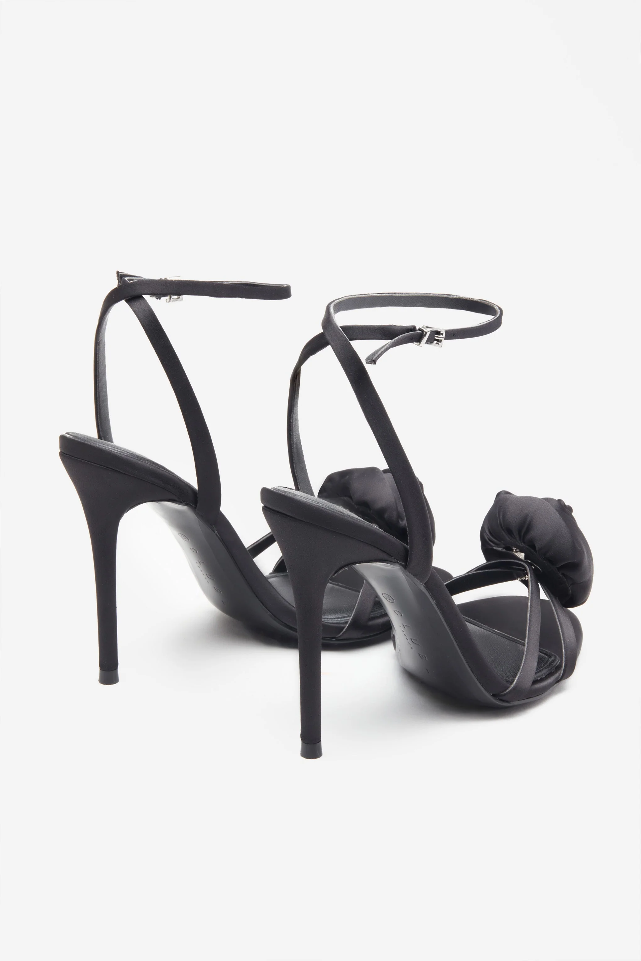 Sweet Step | Sandales en satin noir à talons aiguilles et fleur amovible